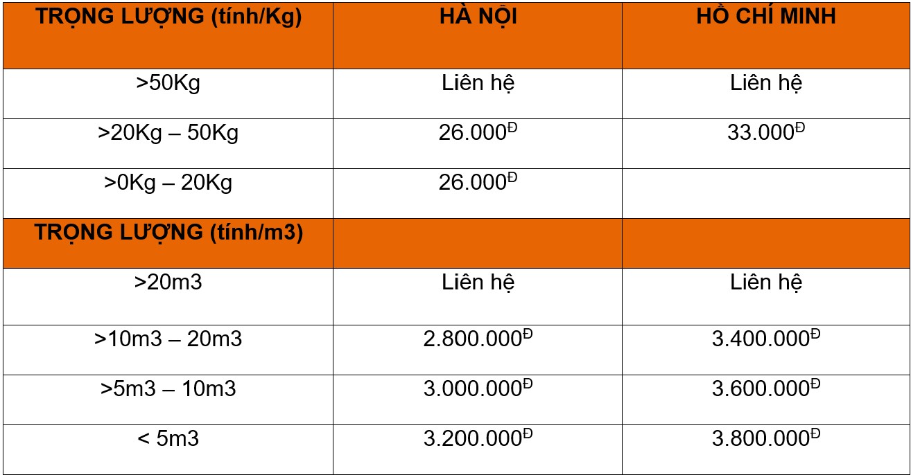 - Phí vận chuyển được tính theo hai cách là trọng lượng (kg) theo hàng nặng, và thể tích (m3) cho hàng cồng kềnh.